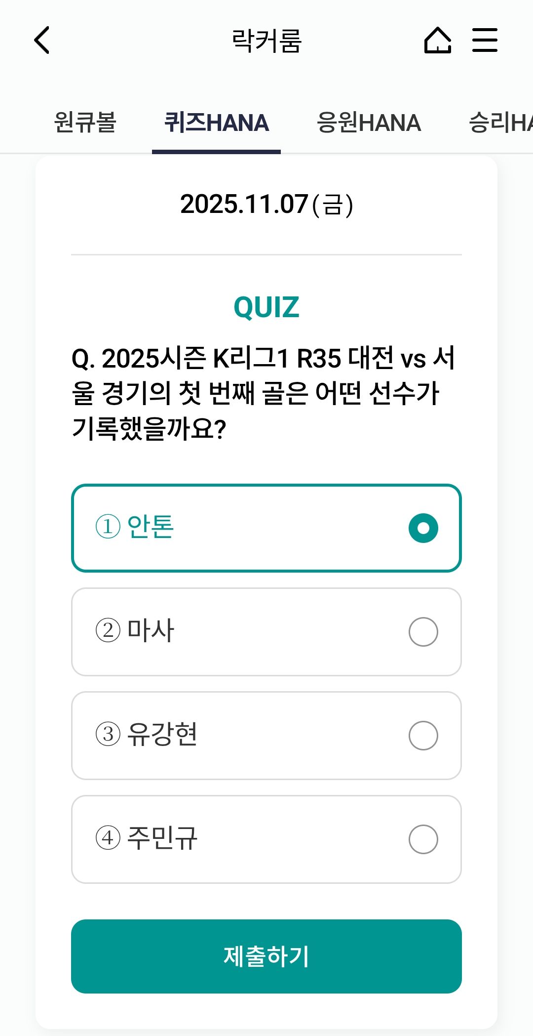 ⚽ 오늘의 하나원큐 축구퀴즈 정답 (2025년 11월 7일)