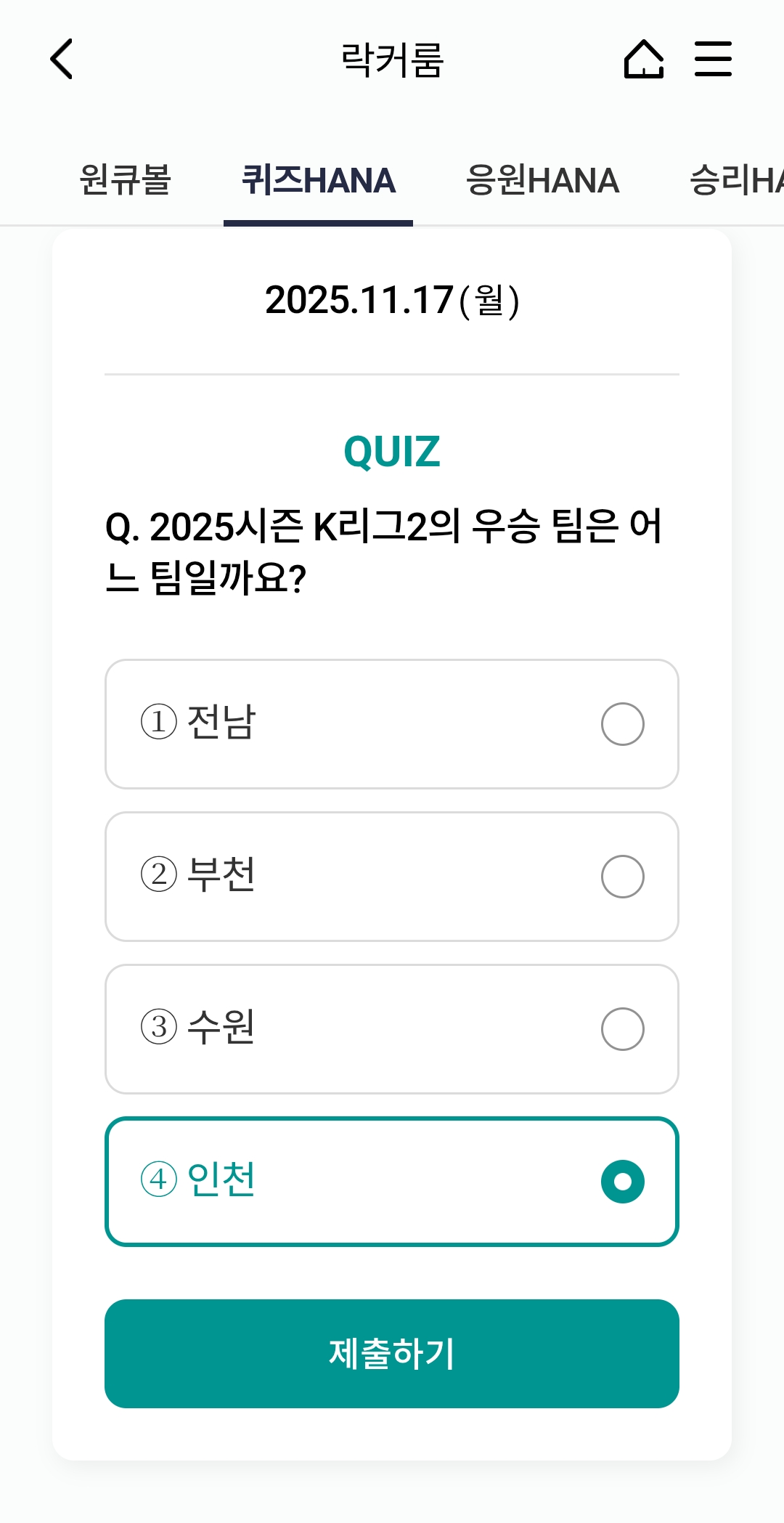 ⚽ 오늘의 하나원큐 축구퀴즈 정답 (2025년 11월 17일)