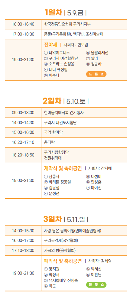 - 포토존·체험존·먹거리존·드론쇼(1일차 밤)·불꽃쇼(폐막식) 등도 놓치지 마세요.