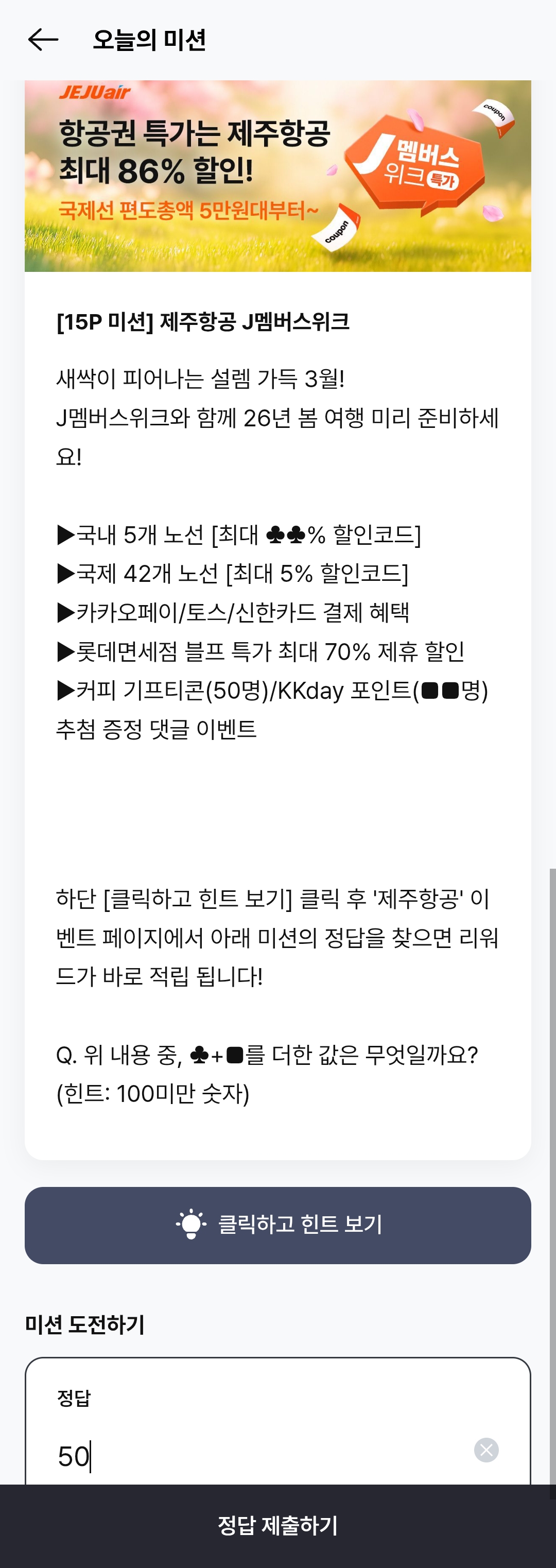 아래에서 제주항공 ♣️+⬛️ 합 문제의 최신 정답을 확인해 보시고, 리워드 포인트 놓치지 마세요!