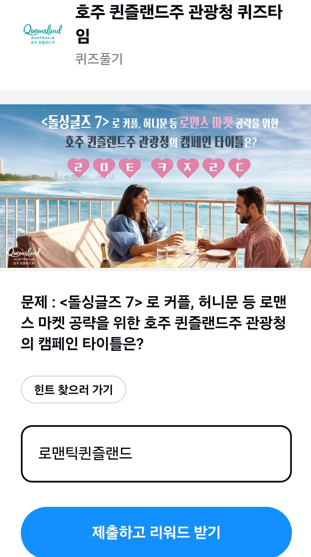 - 문제:문제 : <돌싱글즈 7>로 커플, 허니문 등 로맨 스 마켓 공략을 위한 호주 퀸즐랜드주 관광청 의 캠페인 타이틀은?