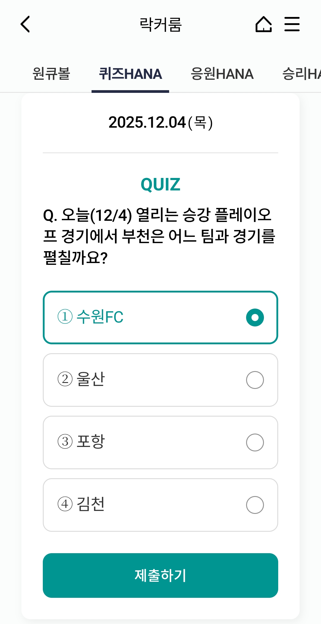 ⚽ 오늘의 하나원큐 축구퀴즈 정답 (2025년 12월 4일)
