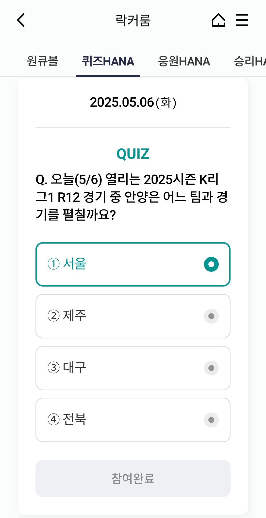 📅 2025년 5월 6일 하나원큐 축구퀴즈