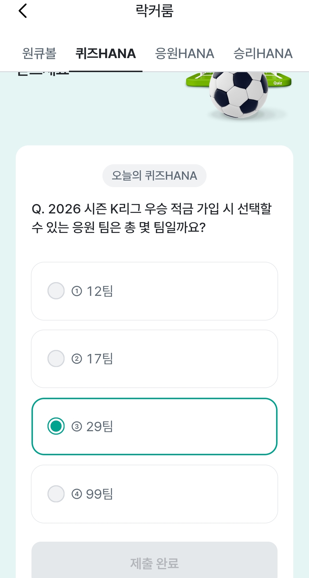 하나원큐 축구퀴즈는 축구 상식을 쌓으며 재미있게 원큐볼 적립까지 가능한 인기 이벤트로,