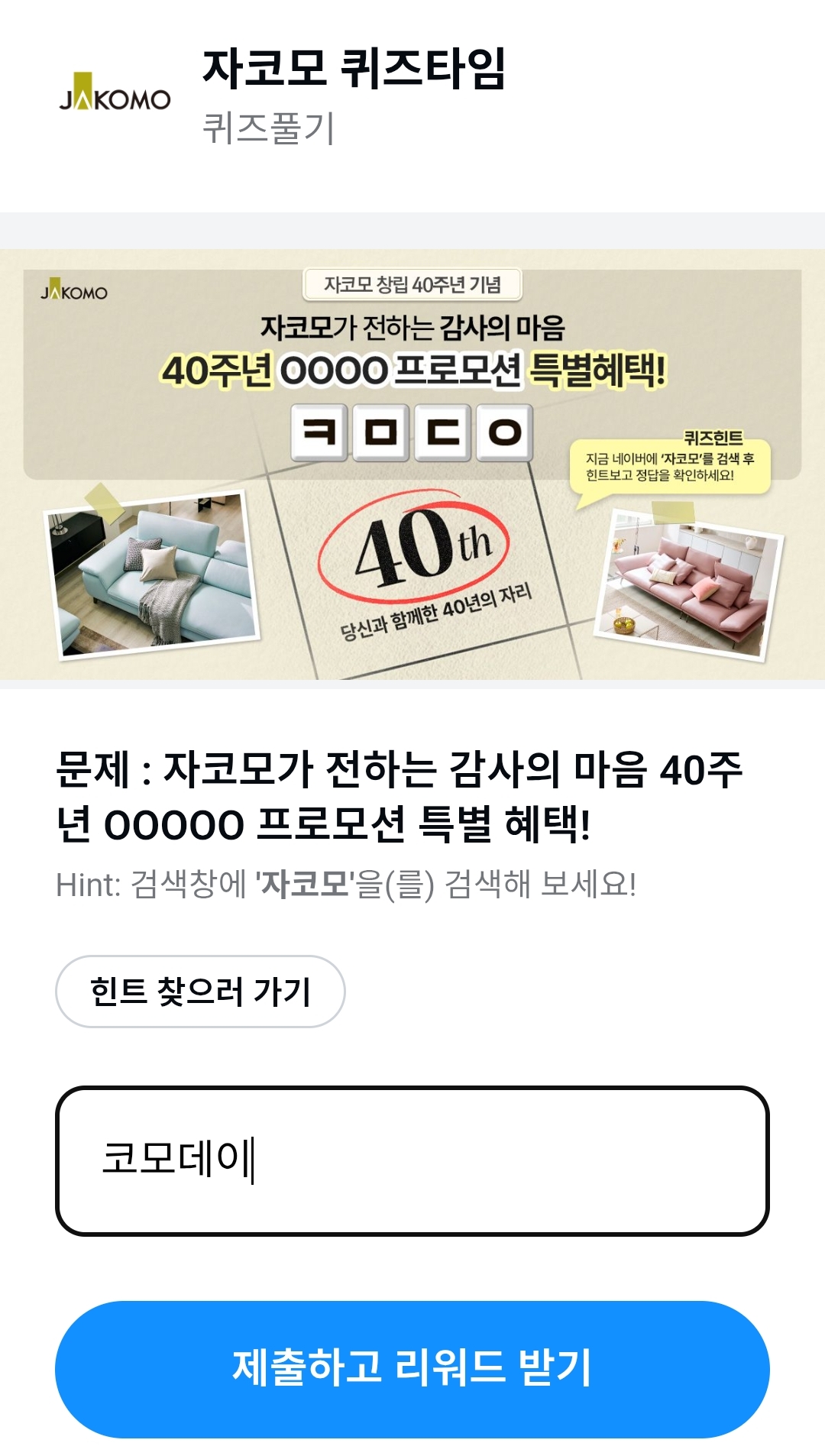 - 문제: 문제 : 자코모가 전하는 감사의 마음 40주 년 00000 프로모션 특별 혜택! (ㅋㅁㄷㅇ)
