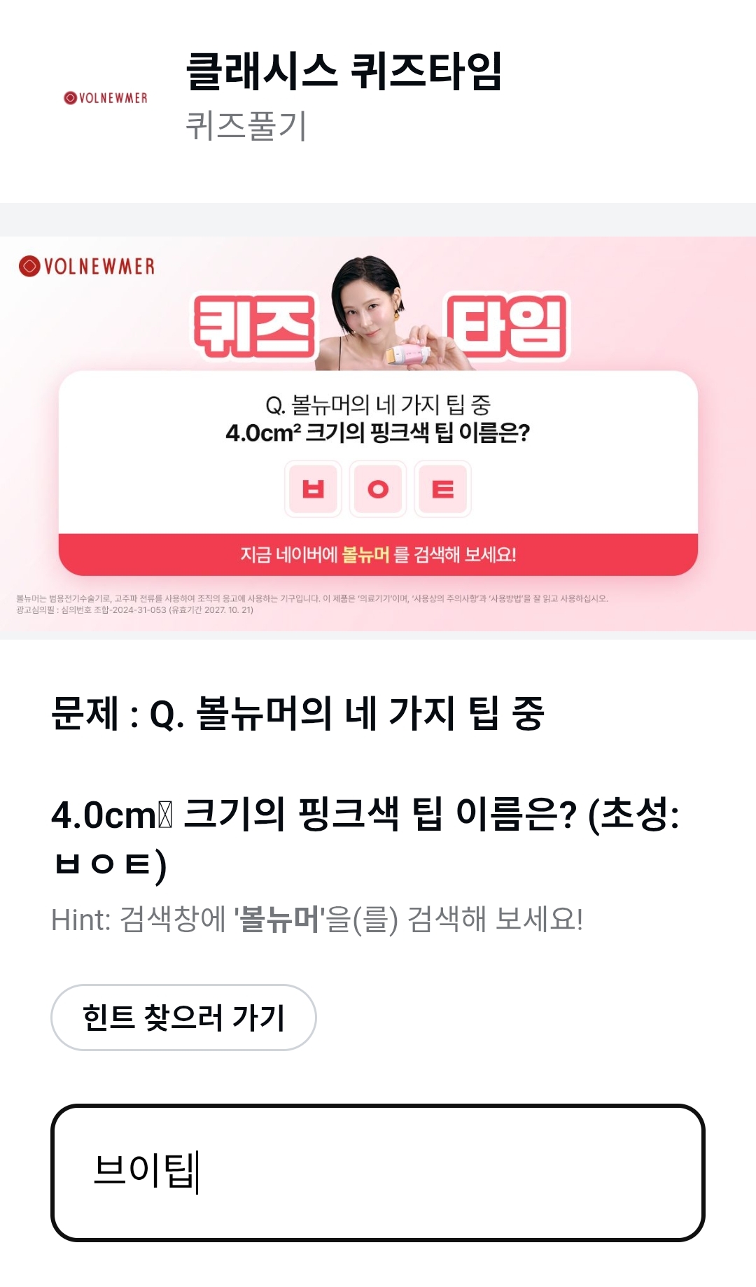 - 문제: 볼뉴머의 네 가지 팁 중4.0cm 크기의 핑크색 팁 이름은? (초성: ㅂㅇㅌ)