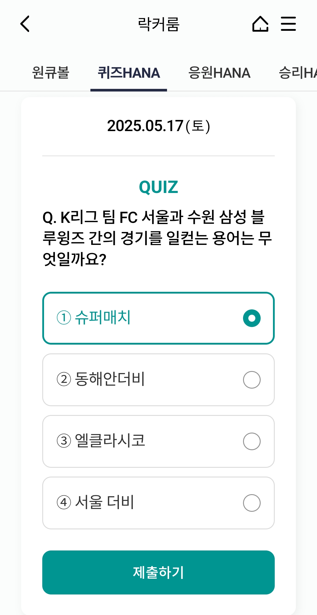 📅 2025년 5월 17일 하나원큐 축구퀴즈