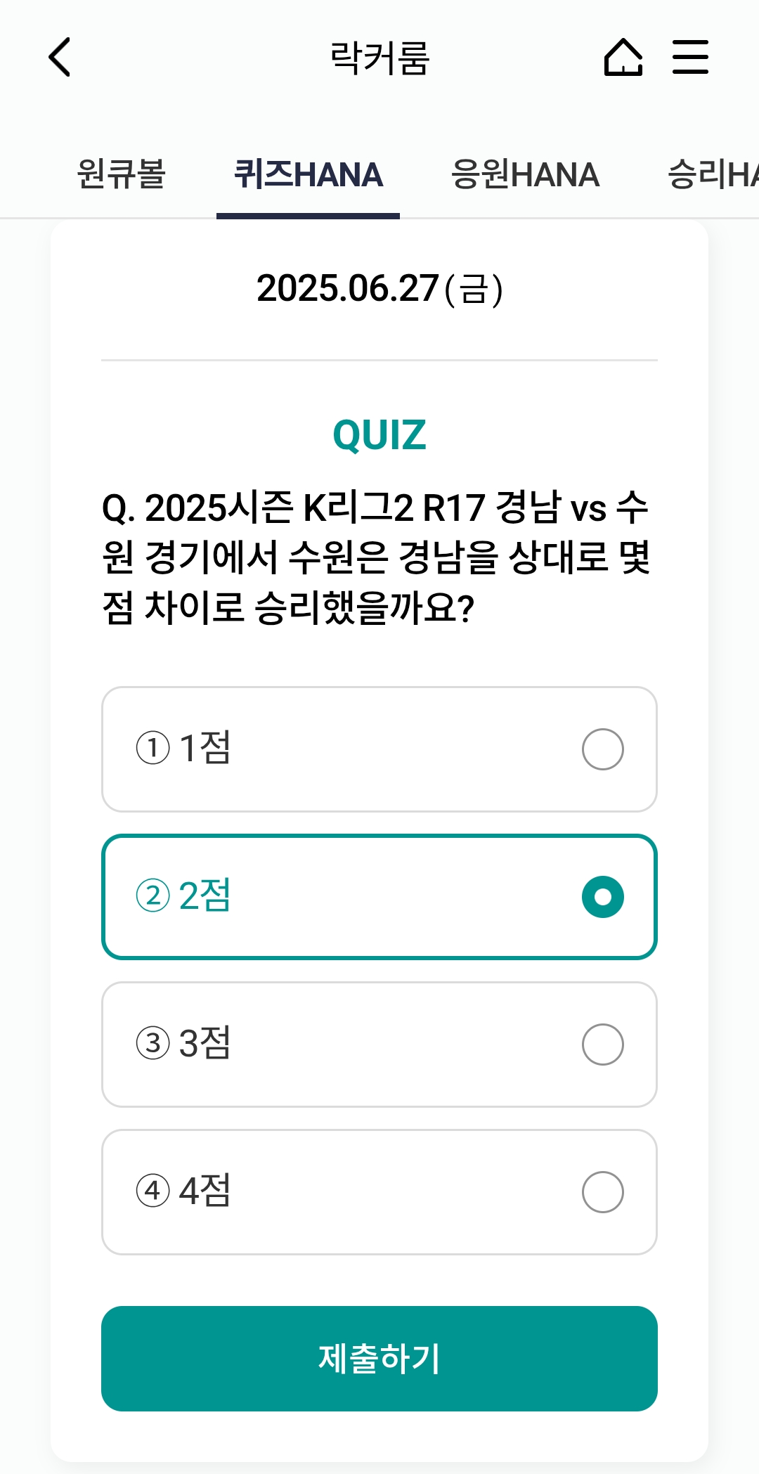 오늘의 하나원큐 축구퀴즈 정답 (2025년 6월 27일)