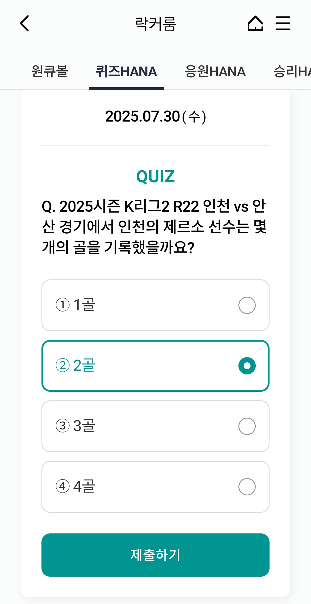 오늘의 하나원큐 축구퀴즈 정답 (2025년 7월 30일)