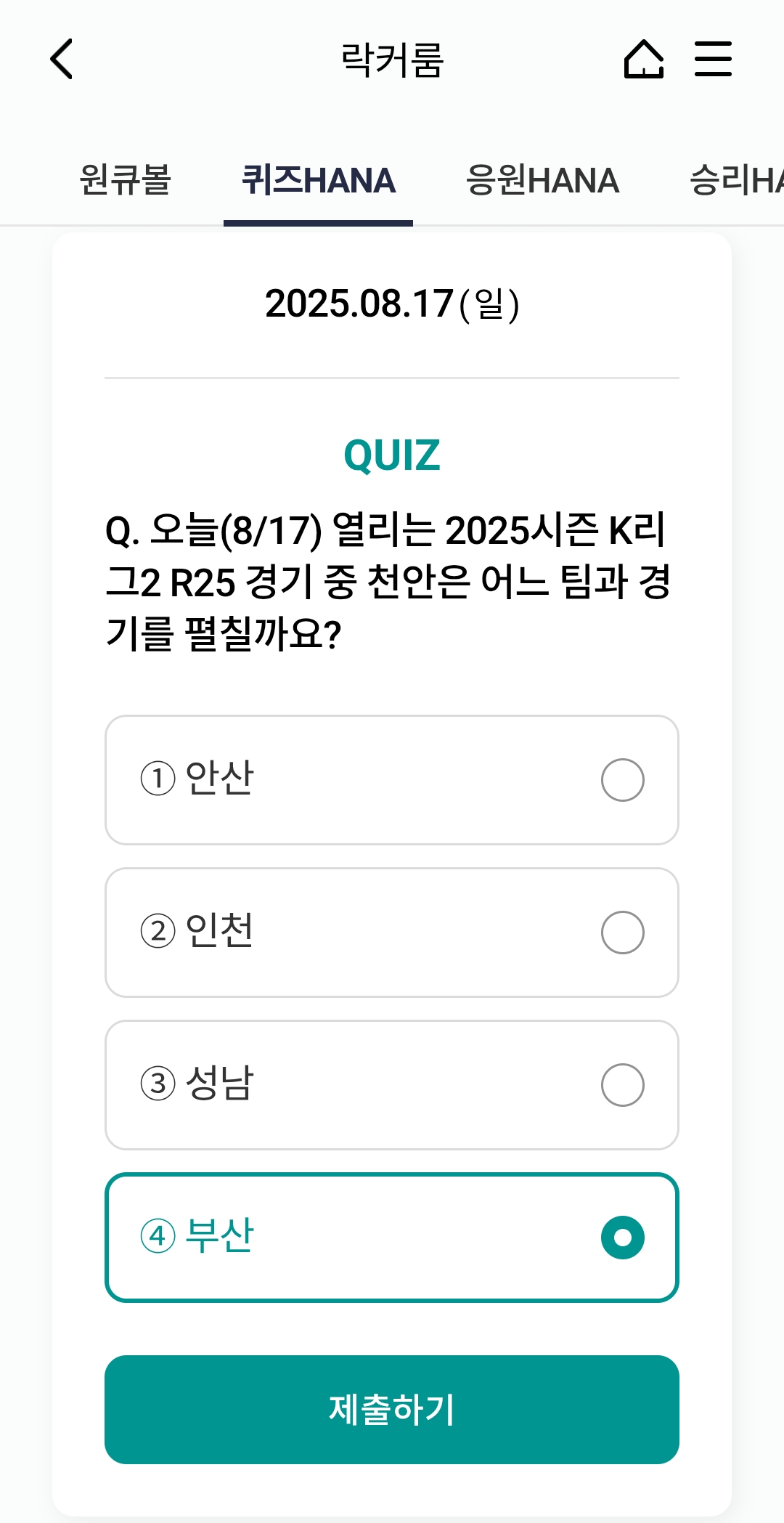 오늘의 하나원큐 축구퀴즈 정답 (2025년 8월 17일)