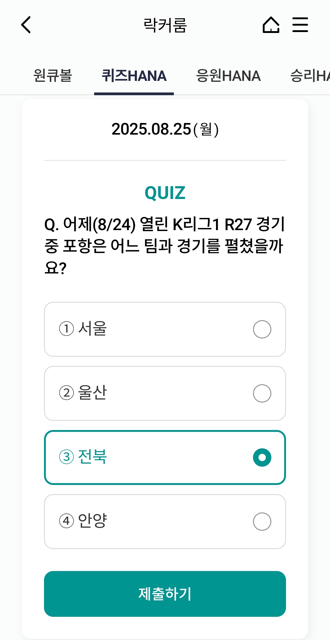 오늘의 하나원큐 축구퀴즈 정답 (2025년 8월 25일)