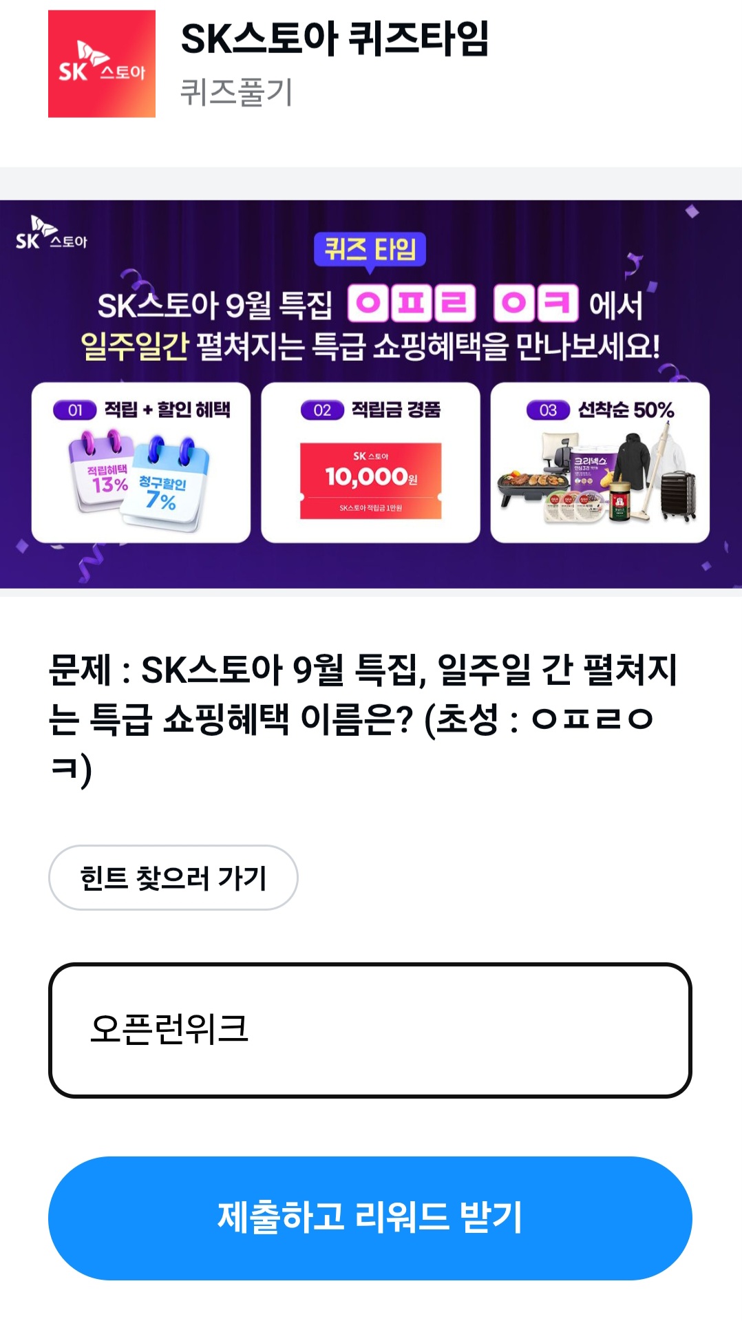 아래에서 SK스토아 9월 특집 'ㅇㅍㄹㅇㅋ' 문제의 최신 정답을 확인해 보시고, 리워드 포인트 놓치지 마세요!