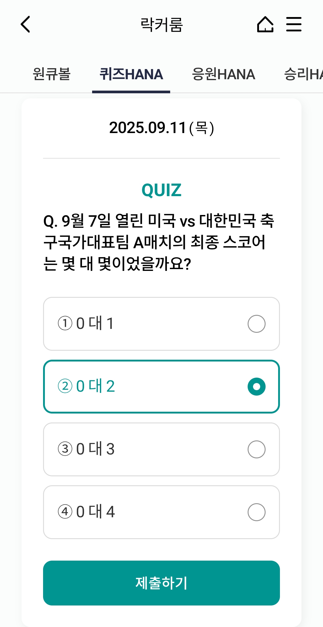 오늘의 하나원큐 축구퀴즈 정답 (2025년 9월 11일)