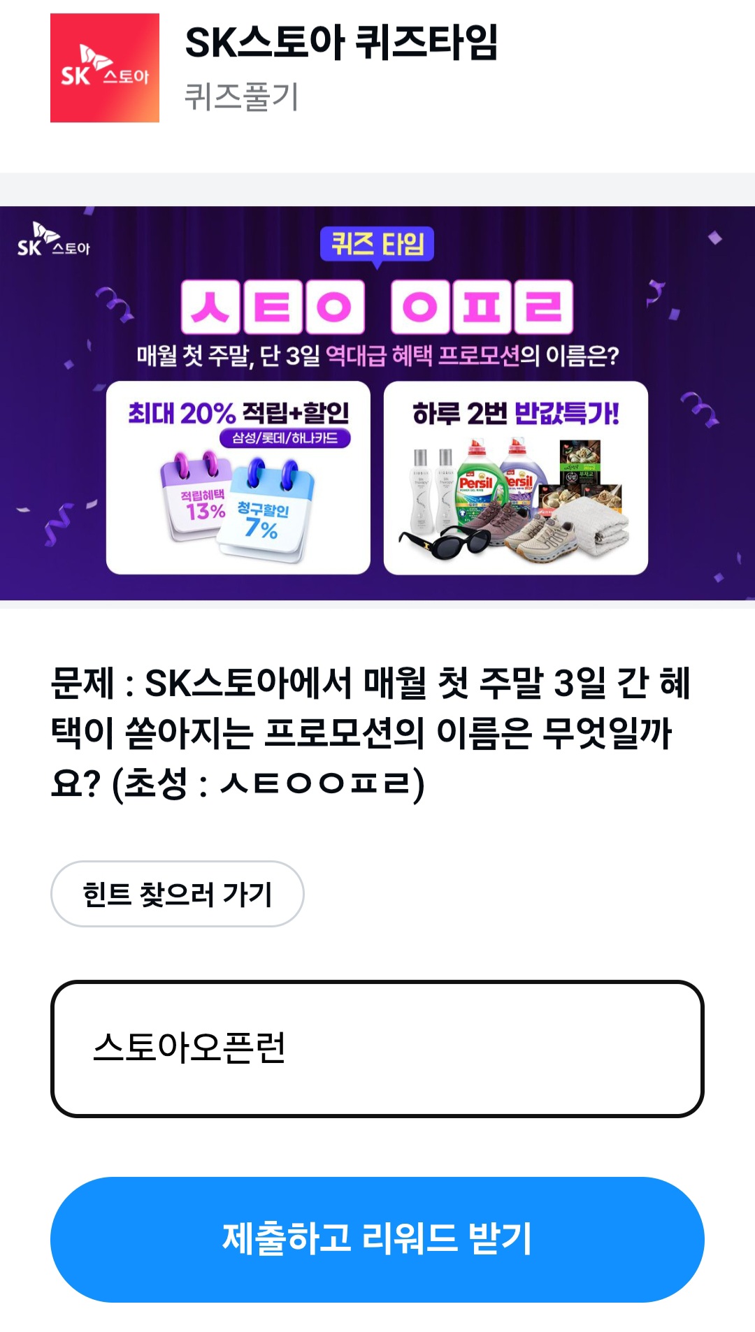 - 문제: SK스토아에서 매월 첫 주말 3일간 혜택이 쏟아지는 프로모션의 이름은 무엇일까요? (초성:ㅅㅌㅇㅇㅍㄹ)
