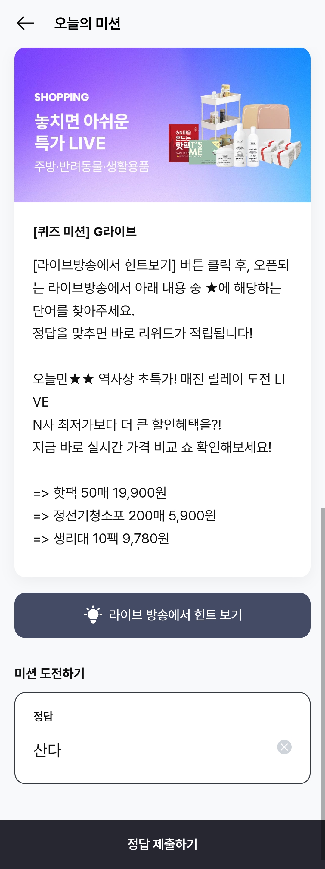 단어를 찾아주세요. 정답을 맞추면 바로 리워드가 적립됩니다! 오늘만 ⭐️ 역사상 초특가 매진 릴레이 도전 LIVE