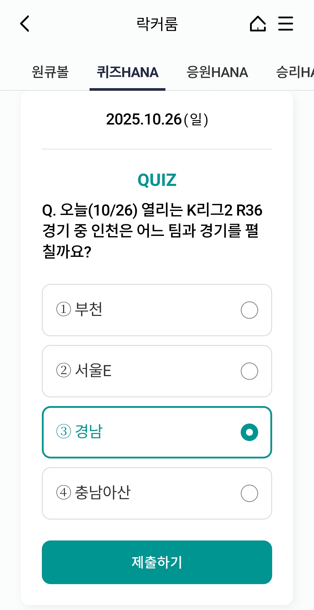 ⚽ 오늘의 하나원큐 축구퀴즈 정답 (2025년 10월 26일)