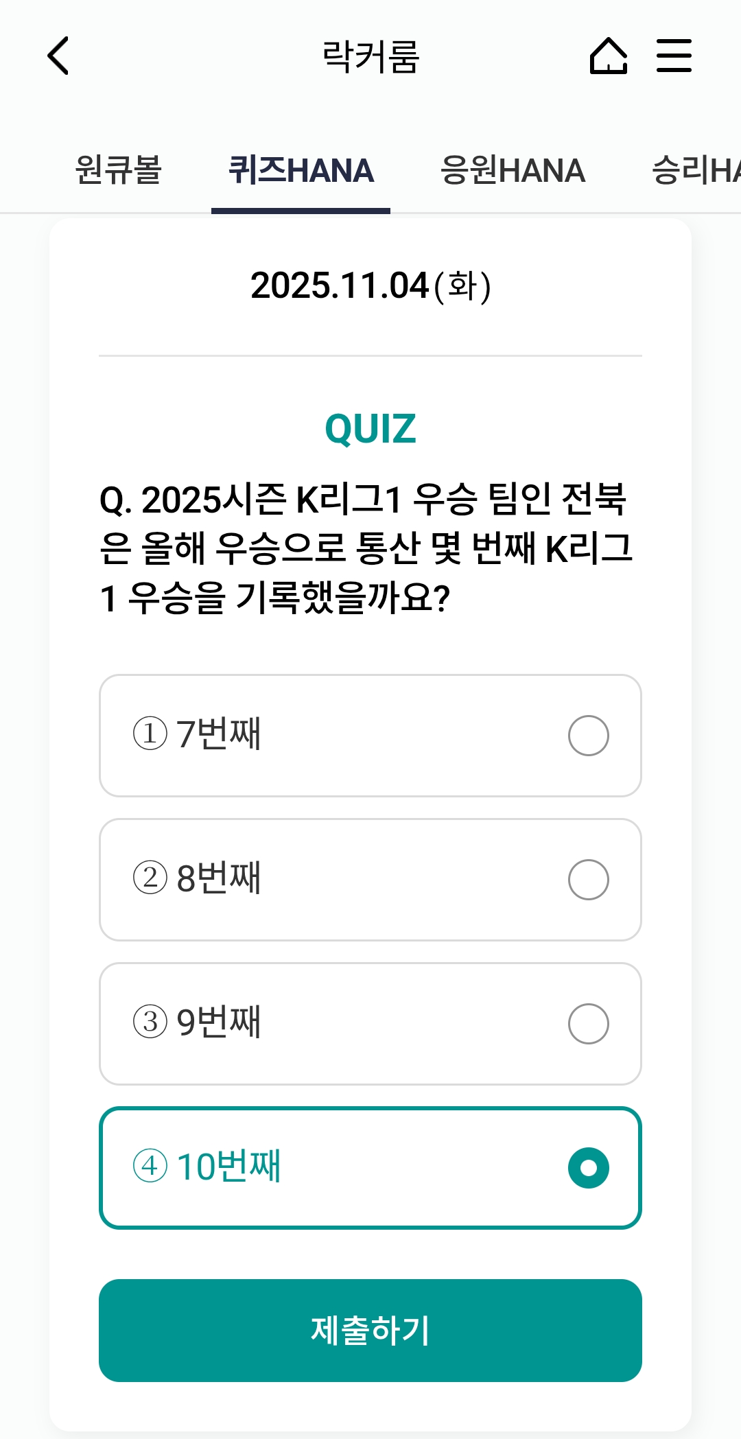⚽ 오늘의 하나원큐 축구퀴즈 정답 (2025년 11월 4일)