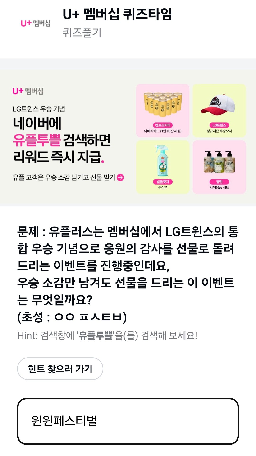- 문제: 유플러스는 멤버십에서 LG트윈스의 통합우승 기념으로 응원의 감사를 선물로 돌리는 이벤트를 진행중인데요,우승 소감만 남겨도 선물을 드리는 이벤트는 무엇일까요? (초성:ㅇㅇㅍㅅㅌㅂ)
