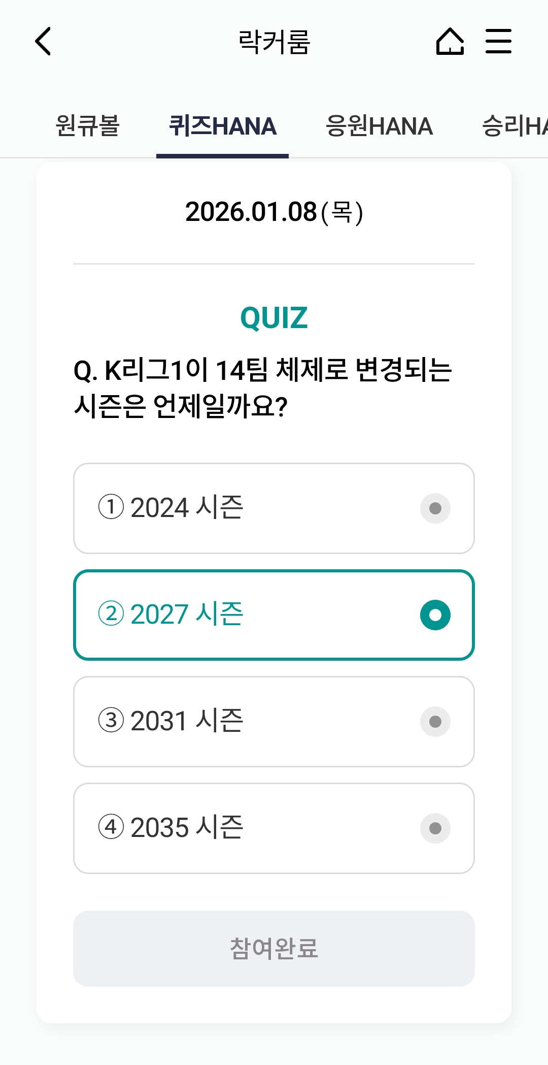 ⚽ 오늘의 하나원큐 축구퀴즈 정답 (2026년 1월 8일)