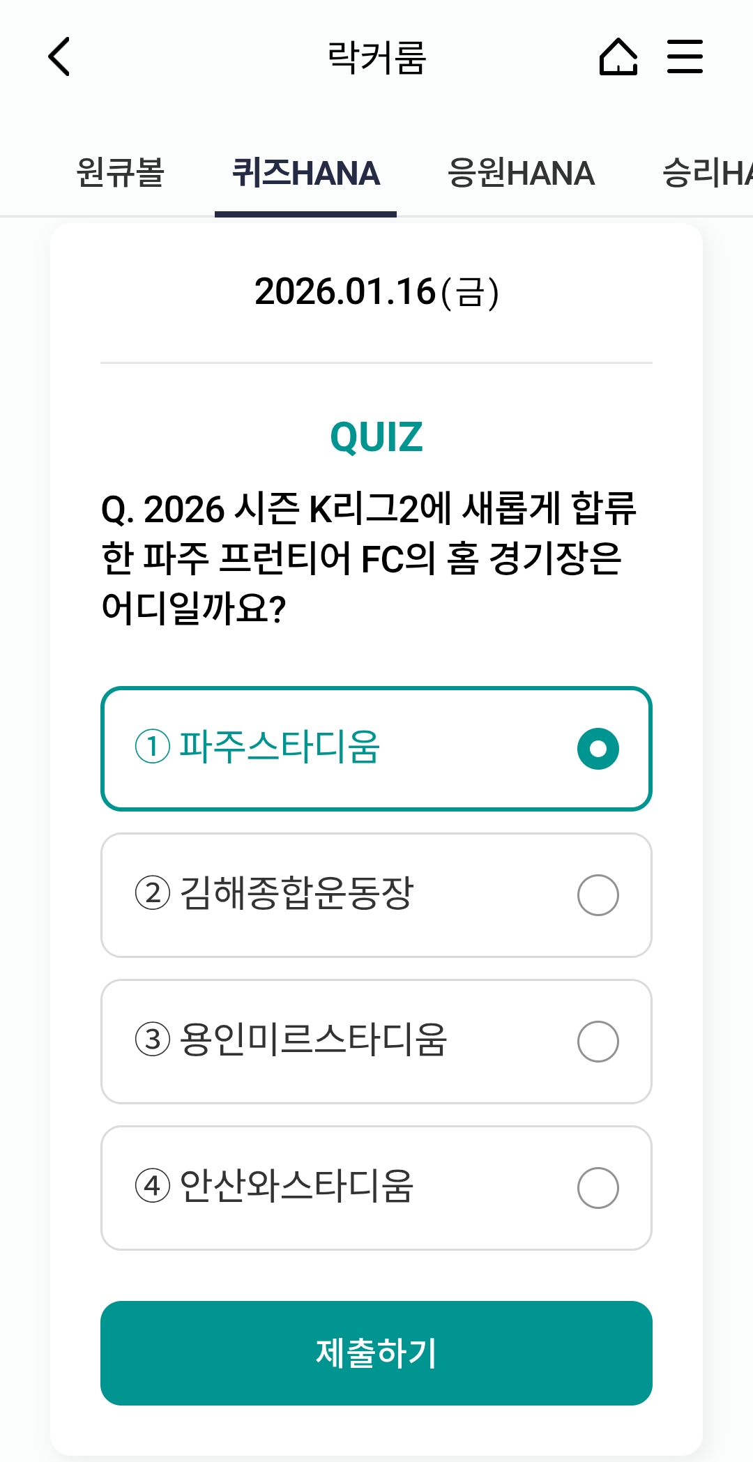 ⚽ 오늘의 하나원큐 축구퀴즈 정답 (2026년 1월 16일)