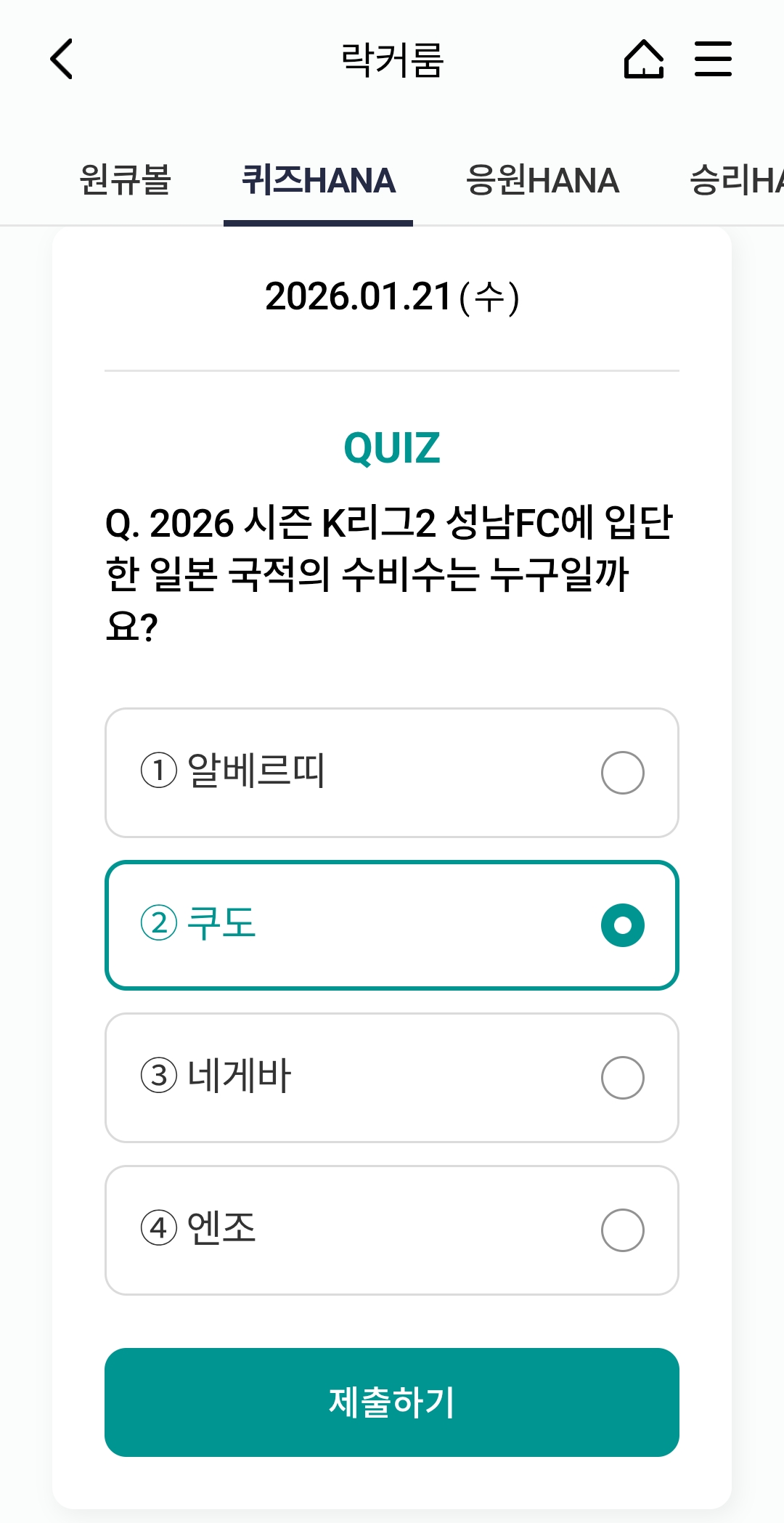 하나원큐 축구퀴즈 1월 21일 정답 및 원큐볼 적립 팁
