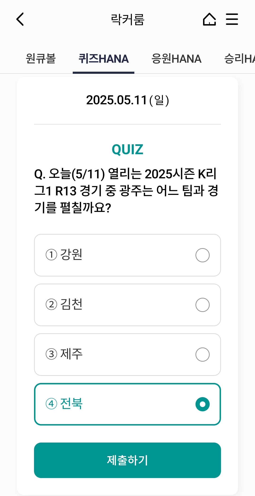 하나원큐 축구퀴즈 정답 ⚽ 2025년 5월 11일