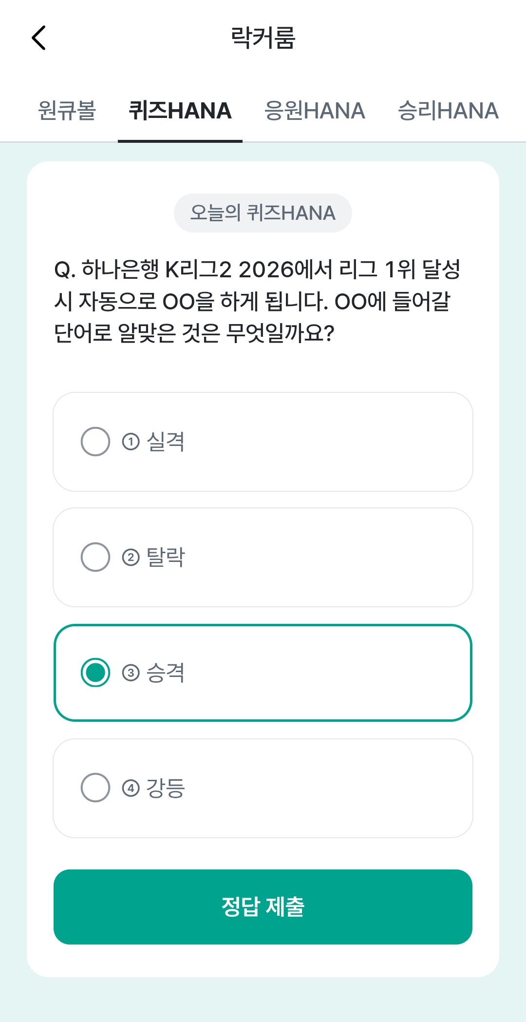 하나원큐 축구퀴즈 정답 입력 후 응원HANA 탭에서 K리그1, K리그2 응원으로
