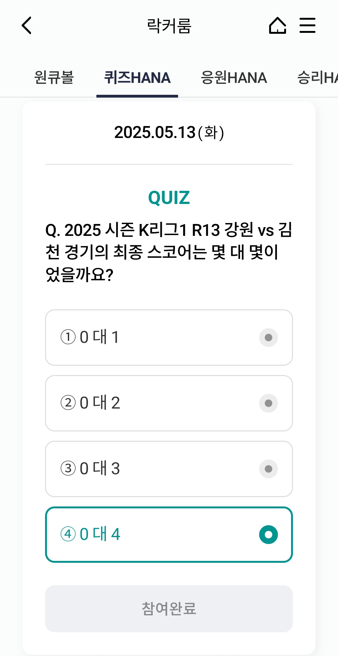 하나원큐 축구퀴즈 정답 ⚽ 2025년 5월 13일