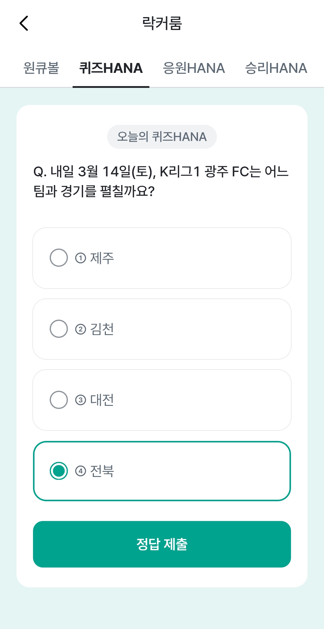 하나원큐 축구퀴즈 정답 입력 후 응원HANA 탭에서 K리그1, K리그2 응원으로