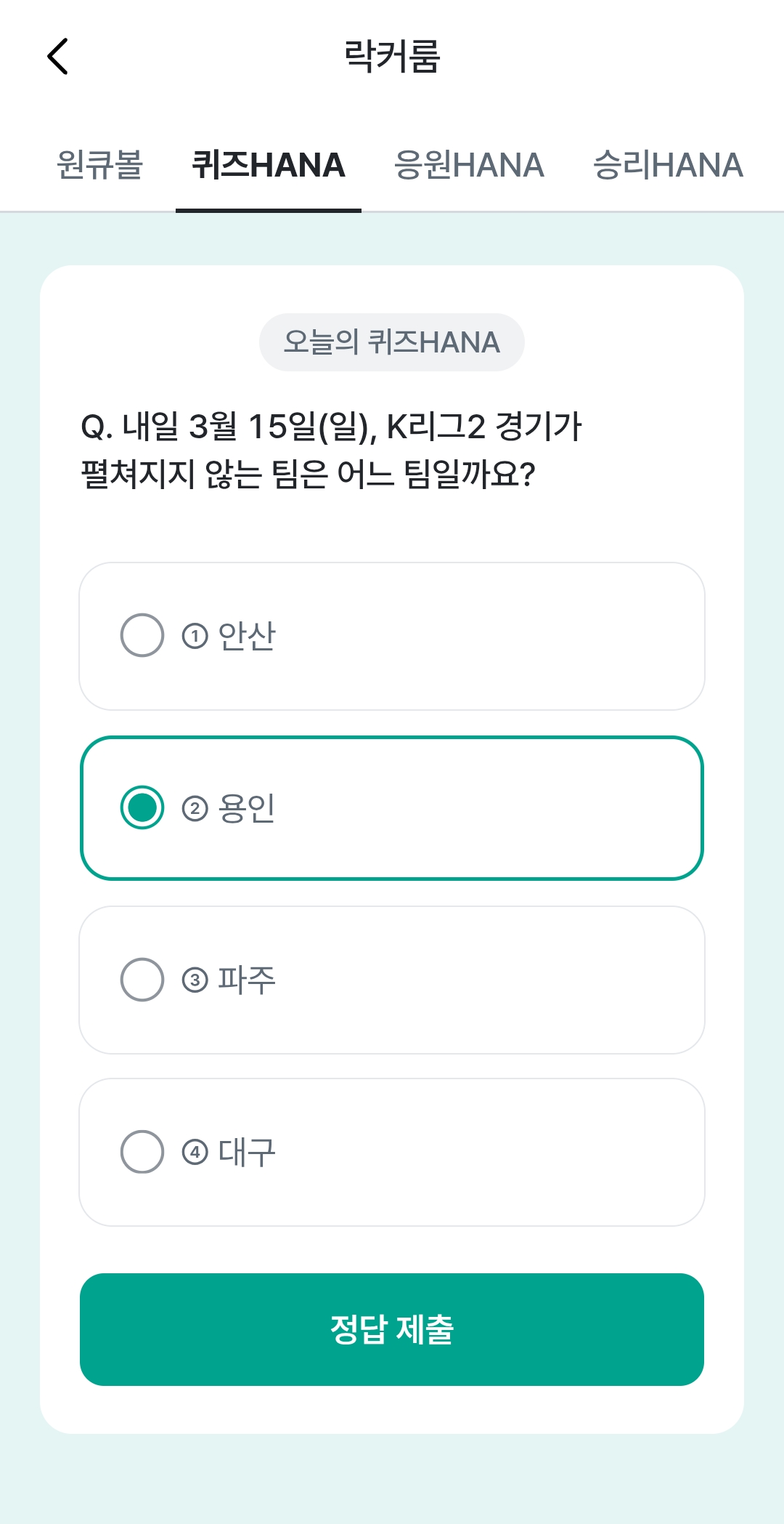 하나원큐 축구퀴즈 정답 입력 후 응원HANA 탭에서 K리그1, K리그2 응원으로