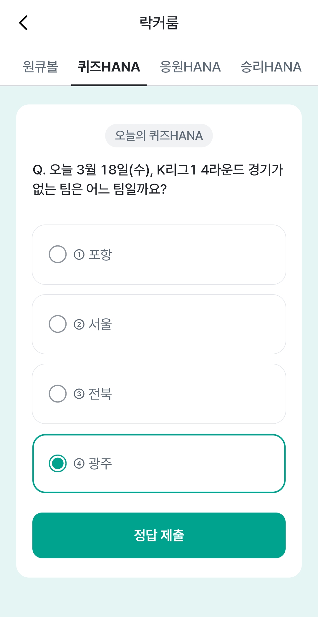 하나원큐 축구퀴즈 정답 입력 후 응원HANA 탭에서 K리그1, K리그2 응원으로