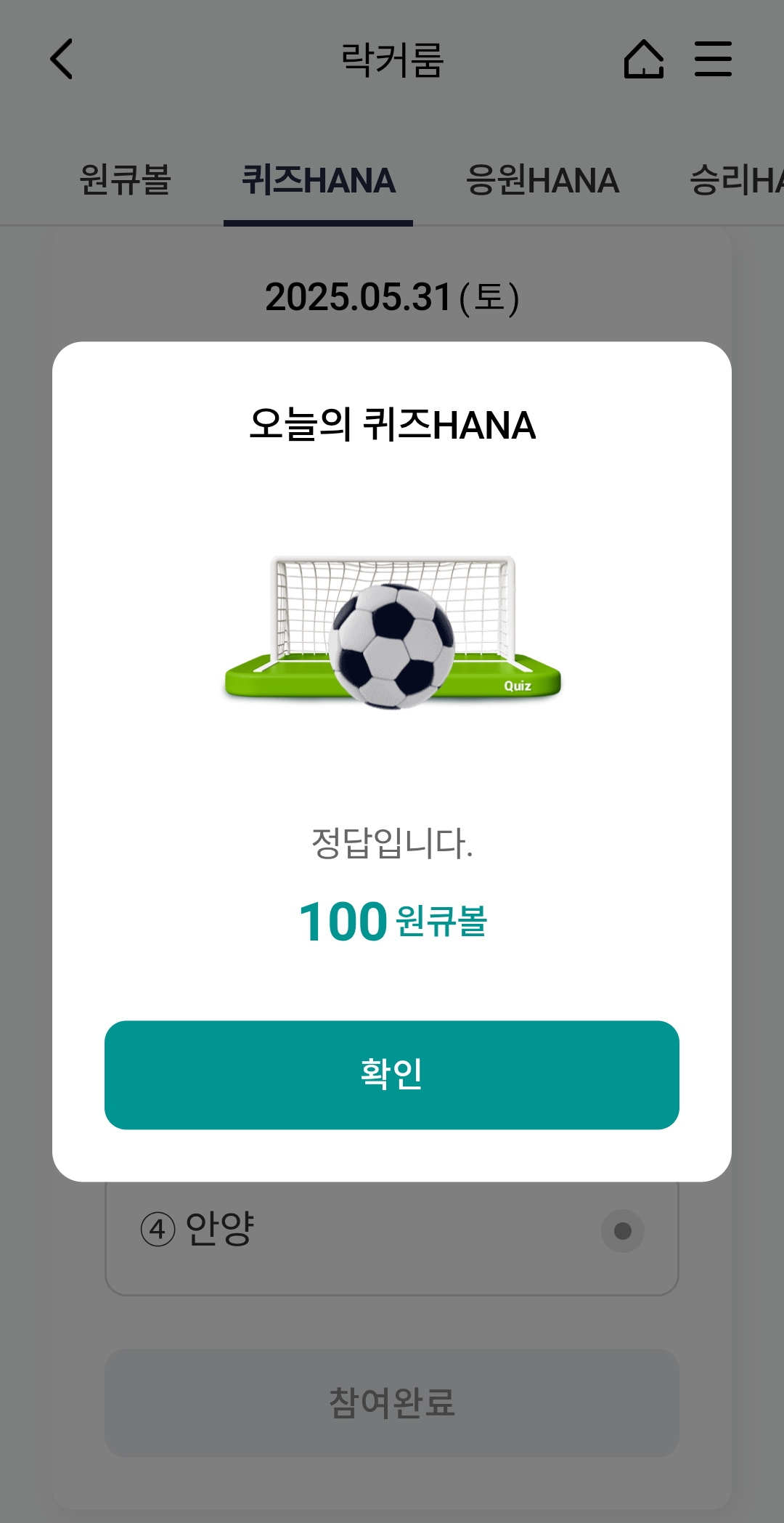 2025년 5월 31일 하나원큐 축구퀴즈 정답 및 원큐볼 적립 팁