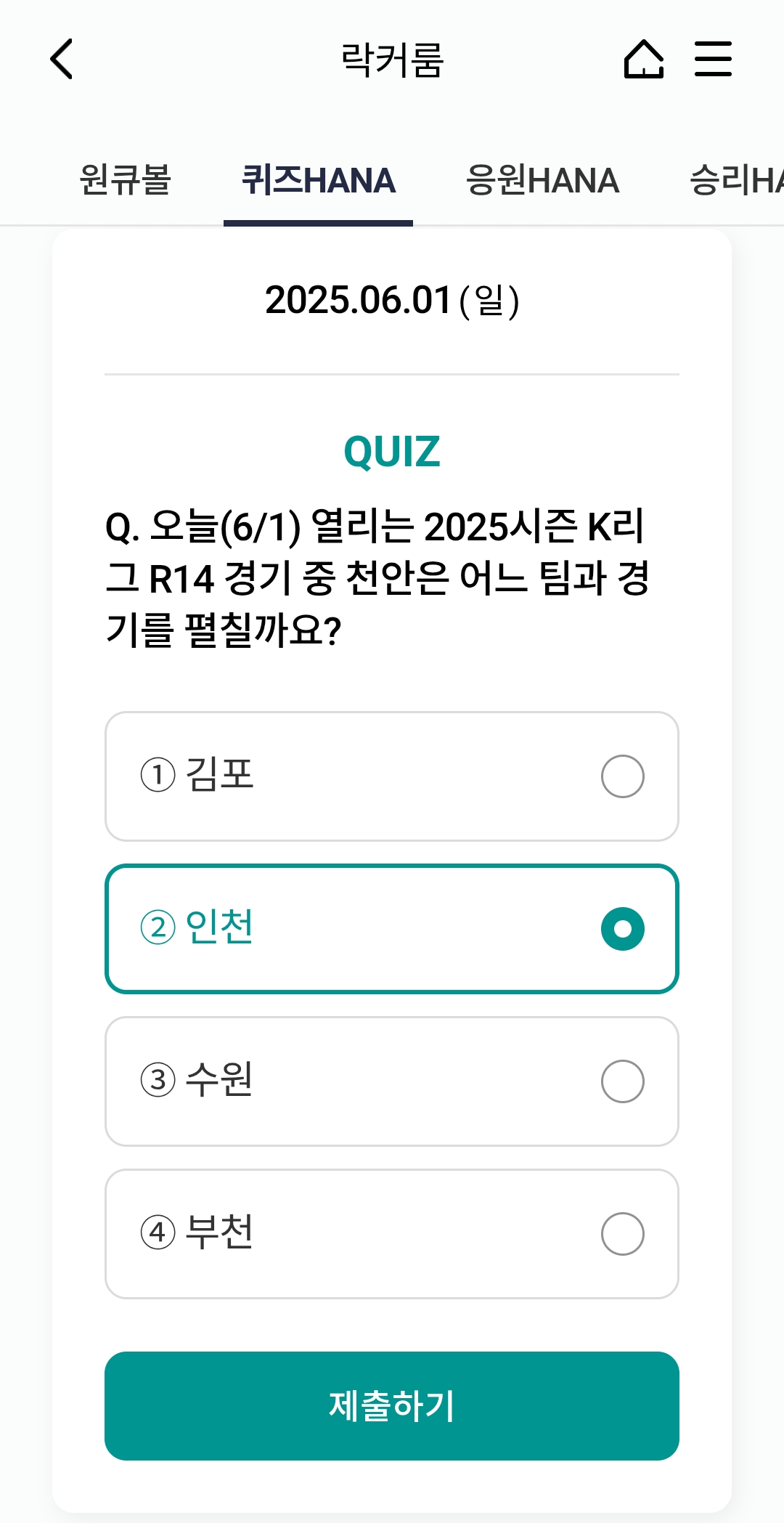 오늘의 하나원큐 축구퀴즈 정답 (2025년 6월 1일)