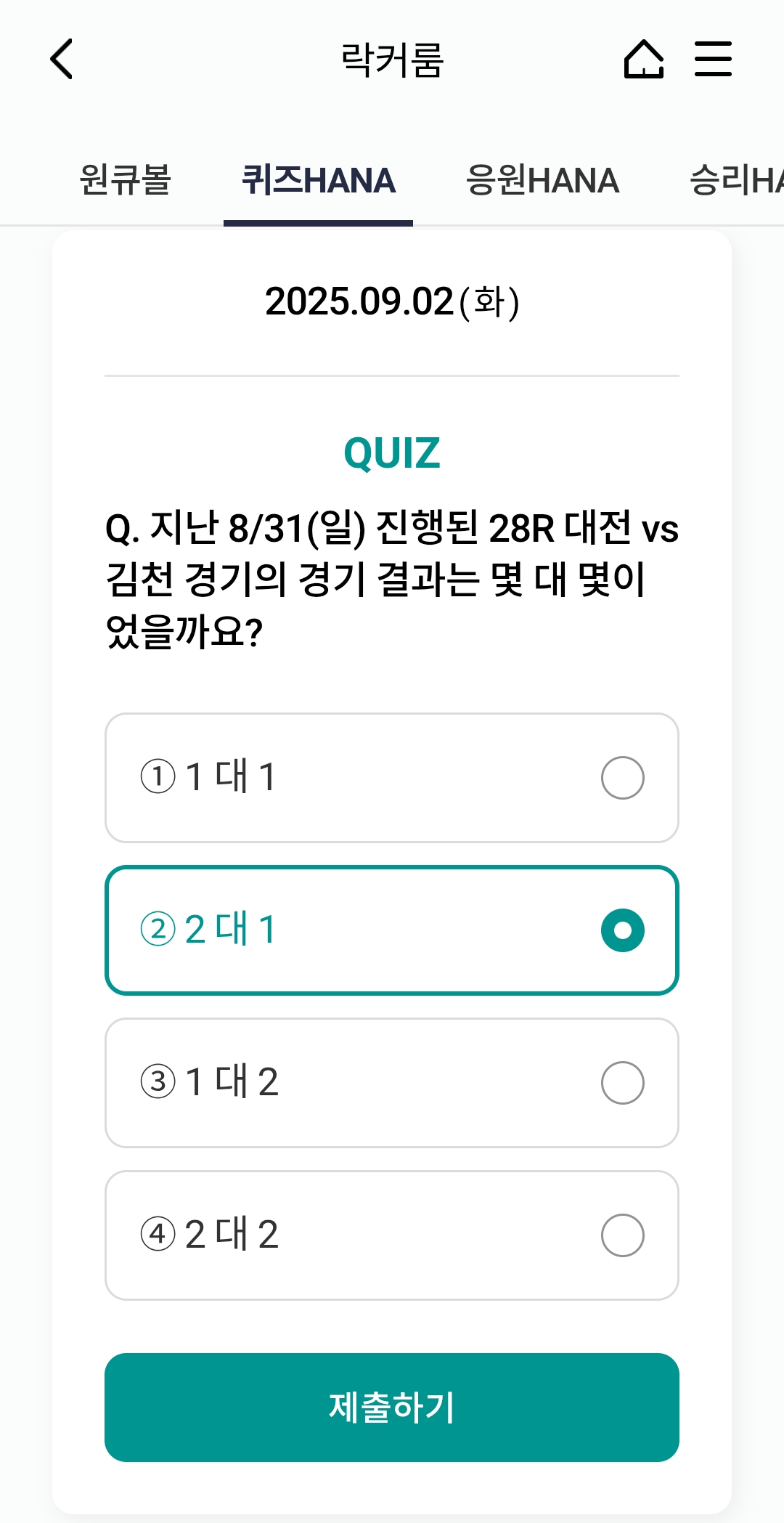 오늘의 하나원큐 축구퀴즈 정답 (2025년 9월 2일)