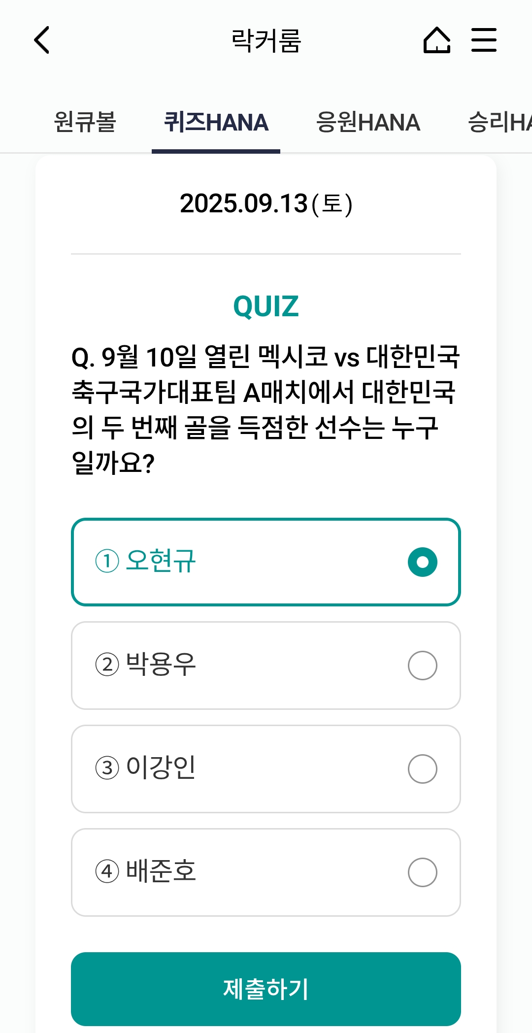 오늘의 하나원큐 축구퀴즈 정답 (2025년 9월 13일)