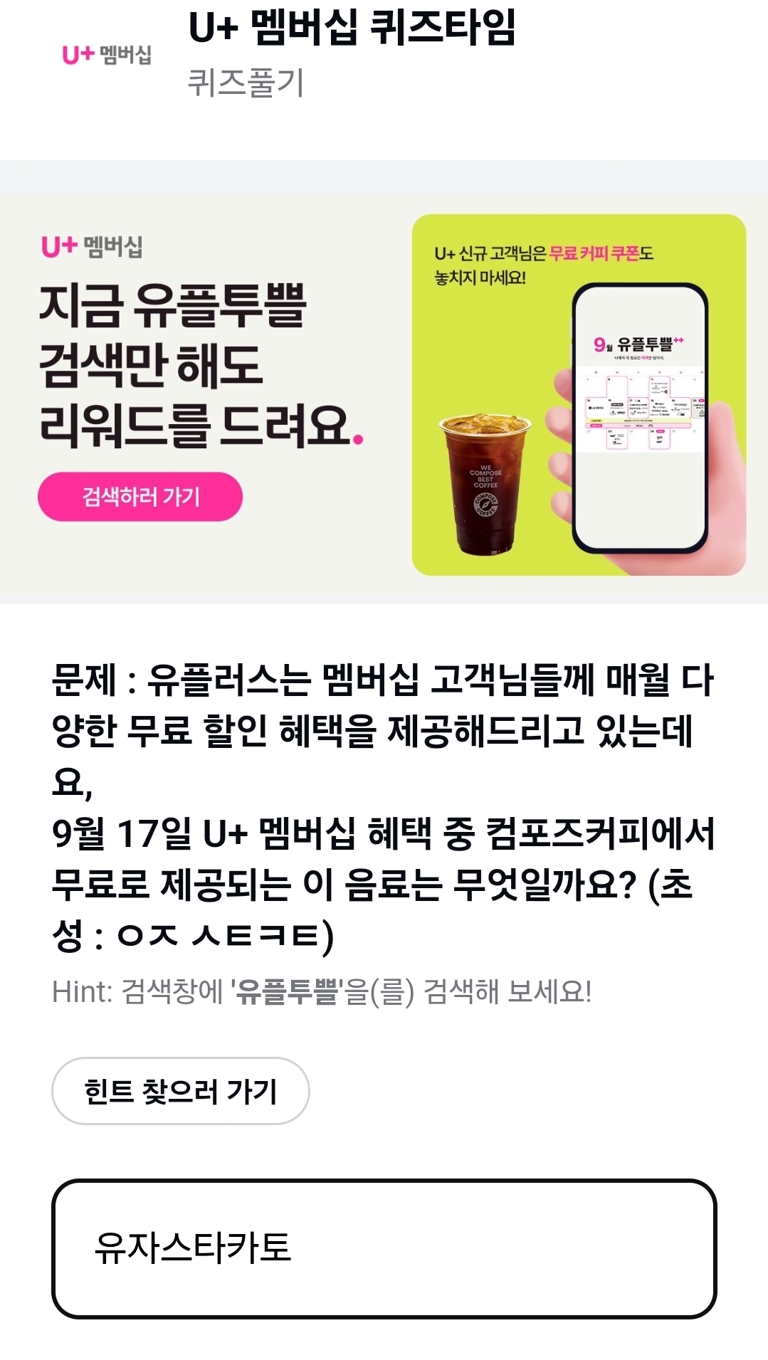 9월 17일 U+ 멤버십 혜택 중 컴포즈커피에서무료로 제공되는 이 음료는 무엇일까요? (초성:ㅇㅈ ㅅㅌㅋㅌ)