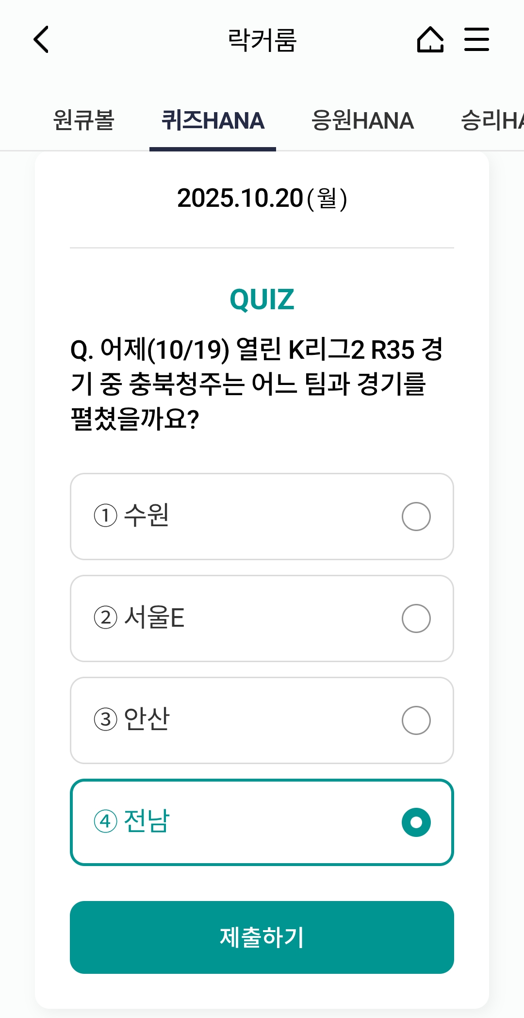 ⚽ 오늘의 하나원큐 축구퀴즈 정답 (2025년 10월 20일)