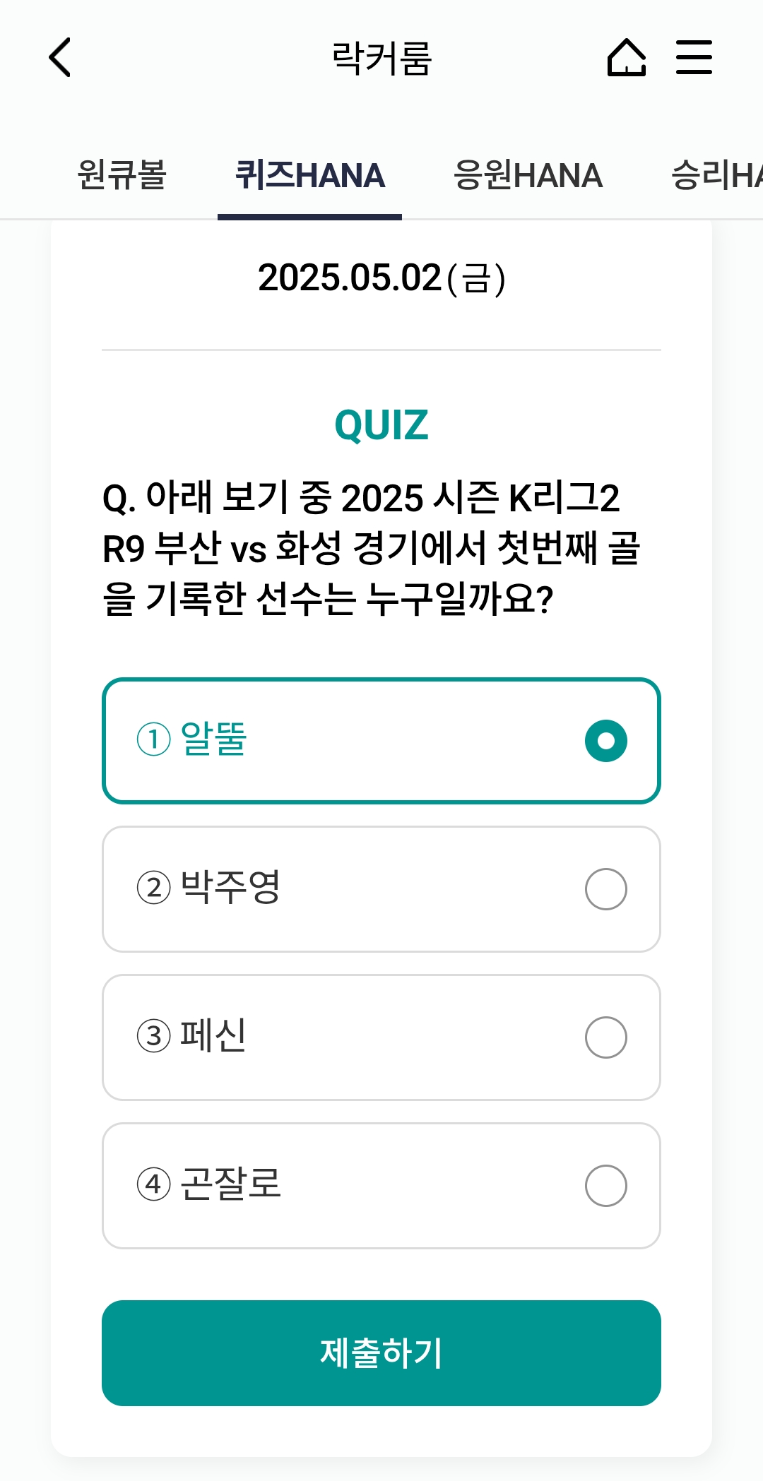 📅 2025년 5월 2 일 하나원큐 축구퀴즈